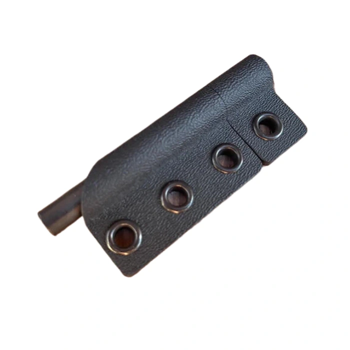 Knivslidsskyddet finns i öglor på ena sidan och öljetter på båda sidor. Kardborreband är idealiskt för att fästa kniven på ryggsäckens rem. Förutom Kydex-manteln kan jag fästa en eldstålhållare, valfritt med brandstål (80 mm eller 100 mm lång).